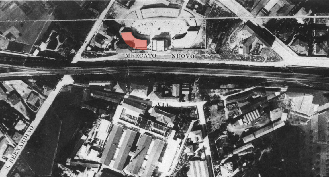 L’area del “Mercato nuovo”, o ortofrutticolo, in una aerofotogrammetria della città di Bergamo,1924 (©Museo delle storie di Bergamo, Archivio fotografico Sestini, Dono Famiglia Patelli) - The “new market”, or fruit and vegetable area, taken from an aerial photograph of Bergamo, 1924 (©Museo delle storie di Bergamo, Archivio fotografico Sestini, Dono Famiglia Patelli)
